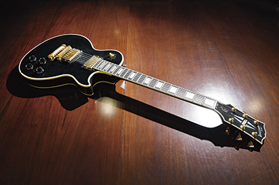 ミロク情報サービスの是枝周樹社長は、8歳のころからギターを続けている。現在、ギターは10本ほど所有しており、その中からギブソンの「レスポールカスタム」を持参してもらった。