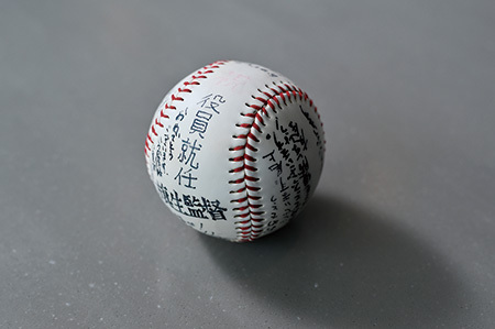 野球ボールに書かれた寄せ書き。旧富士ゼロックスの執行役員に就任した2019年、社内野球部のメンバーから贈られた。野球好きの父親の影響もあってか、「物心つく頃にはすでに野球好きだった」と、野球をプレーするのも観るのも好きだと話す。社内での草野球の歴史は古く、旧富士ゼロックス時代からかれこれ60年ほど続いている。旗生社長も、新卒入社で広島の営業所に勤務していたときから草野球を楽しんでいるとのこと。
