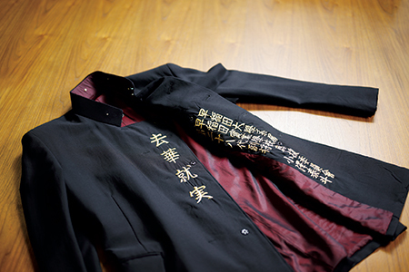 早稲田実業学校でかつて応援団に所属していた時に着用していた「長ラン」を、今でも大切に保管している。外からは見えないが、内側に刺しゅうが施されているのが特徴だ。見た目の華やかさではなく中身を充実させるべきとの意味を表す早稲田実業学校の校是「去華就実」や、「他」「己」「事物」の三つを敬うことを唱えた校訓「三敬主義」といった言葉があしらわれている。