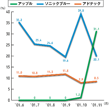 そのため、シリコンオーディオ市場では、アップルを追随しようと、ソニックブルーをはじめ、アドテックやアイ・オー・データ機器など、市場で上位に君臨し続けている各ベンダーがトップシェアを窺う。