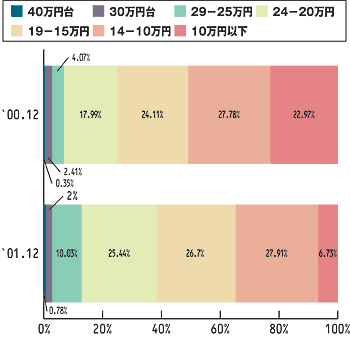 BCNランキングのデスクトップパソコンの販売データを価格帯別に分類し、01年12月と00年12月で比較すると、売れ筋の価格帯がこの1年間に大きく変化したことがわかる。