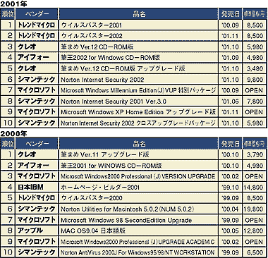 BCNランキングによる2001年のビジネスソフトの販売本数ベストワンは、トレンドマイクロの「ウイルスバスター2001」となった。01年はセキュリティソフトの販売本数が急伸した年であり、ウイルスバスター2001が首位となったことは、これを反映した結果だといえる。また、オープンプライスとなっているマイクロソフトのウィンドウズを除き、トップ10内はいずれも価格が1万円以下の製品。店頭での売れ筋ソフトの低価格化が進んでいることを浮き彫りにした。