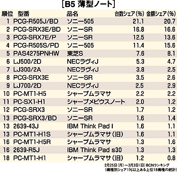 この春、NECと東芝が新製品を投入した“B5薄型ノート”市場。これまでB5薄型は、ソニーの「505」(12型画面)と「SR」(10型画面)の独壇場だった。しかし昨年、シャープの「ムラマサ」(12型画面)が挑戦を始め、この春からNEC、東芝がシャープに続けとばかりに参戦した。最新のB5薄型ノート市場の動向を探った。