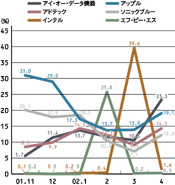 パソコン本体が台数ベース、金額ベースとも前年割れしているなか、シリコンオーディオ市場は、好調な売れ行きをみせている。平均単価は、昨年11月が2万6900円前後に対し、今年4月が2万5000円前後とほとんど値崩れがない。今後は、ADSL加入者が増えることにより、シリコンオーディオの購入者増も期待できる。販売店も、ユーザーが気軽に購入し、収益性が高い製品として注目している。メーカーがシェアを拡大するには、シリコンオーディオの初心者層や中級者層、上級者層に適した製品を開発し、ラインアップの拡充を図ることがシェア拡大の決め手となる。 (佐相彰彦)