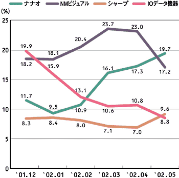 02年5月期の液晶ディスプレイ市場は、ナナオが19.7%のシェアでトップに踊り出た。同社の製品は、4機種が上位10機種以内に入った。トップシェア獲得は、ラインアップの強さが功を奏した。液晶ディスプレイは、前年同月比で台数ベースで28%増と、パソコン関連機器のなかでも比較的堅調に成長している。金額ベースでも、平均単価が上がり同比9%増。収益性が高い商材として期待がかかる。今後はさまざまな層のユーザーに対応するために、ラインアップの拡充が市場で勝ち抜くカギだ。