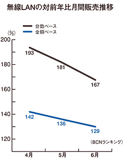 無線LAN市場では、メルコの独走が続いている。6月のメルコの月間販売台数シェアは46.6%、金額シェアは46.1%と、2位のアイ・オー・データ機器(台数10.8%、金額8.8%)、3位のプラネックスコミュニケーションズ(同10.1%、同8.5%)を大きく引き離している。4-6月の対前年比では、若干右肩下がりの印象は受けるものの、成長市場であることには変わりない。