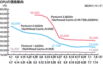 単価の変動で売れ行きが上がるのは、Pentium4 2.26GHz(Northwood Cache=512K FSB=533MHz)やPentium4 2.0AGHz(NorthWood Cache=512KB)のような発売後間もない新製品で、単価が高い製品に限られる。新しいCPUは、既存製品と同程度の価格帯となるなど、ある価格帯に突入すると売れ行きが伸びる傾向にある。販売店が最も利益の高いビジネスができるのもこのタイミングといえるだろう。