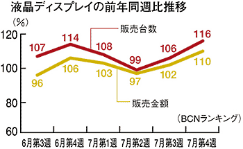 液晶ディスプレイ市場の伸びが堅調だ。図は、BCNランキングで液晶ディスプレイの前年同週比を表したもの。6月第3週から7月第4週までの6週間は、7月第2週に前年同週を若干下回った以外、残りの5週間は台数、金額ともに前年同週を上回る結果となった。