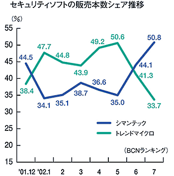 この要因としては、シマンテックが6月7日から限定10万本で開始した「STOP!ウィルスキャンペーン2002」の実施などが挙げられる。このキャンペーンでは、同社の主力製品である「ノートン・インターネットセキュリティ2002」の価格を、9800円から7800円に大幅値下げ。また、パソコントラブル解決ソフト「ノートン・ユーティリティーズ2002体験版」を同梱した。週間ランキングでは、6月3-9日の週ではシマンテックが38.3%、トレンドマイクロが46.3%となっていたが、キャンペーン実施後の6月10-16日の週にはシマンテック43.7%、トレンドマイクロ41.8%と逆転しており、その後の週ではシマンテックがトップシェアを維持している。