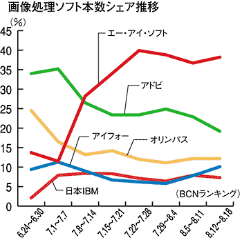画像処理ソフトは、デジカメで撮影したデータを加工するものが多いが、デジカメde!!同時プリントは撮影したデータをきれいに印刷するための処理ソフトで、それまで存在していなかった新たな市場を確立した。今ではエー・アイ・ソフトの看板商品となっている。今回、新バージョンの発売と同時にトップシェア獲得に成功したのは、エー・アイ・ソフトにとって、まさに狙い通りといえるだろう。エー・アイ・ソフトにトップシェアを奪われ、2位となったアドビシステムズは、プロフェッショナルユーザーの画像処理ソフトとして定番となっている「Adobe Photoshop」を販売している。