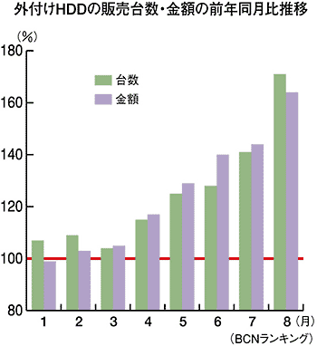 外付けHDDが好調だ。図は今年に入ってからの、外付けHDD市場全体の販売台数と金額の前年同月比推移を表した。図を見ても分かるように、販売台数と金額ともにほぼ前年水準を超えている。