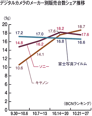 キヤノンでは、デジカメとインクジェットプリンタの拡販を図るため、家庭で写真が出力できるデジタルフォトの訴求に注力。10月からデジカメとプリンタなどを活用したデモコーナーを全国600店舗に設置した。店頭デモは、年末まで予定しており、デジカメとプリンタ両製品の拡販につなげる。キヤノン販売の芦澤光二・取締役電子機器販売事業部長は、「デジカメに関しては、前年比70%増を狙う」と自信をみせる。図は、最近4週間におけるメーカー別販売台数シェアの推移を示した。これをみても分かるように、最近4週間でキヤノンをはじめ、富士写真フイルム、ソニーが入れ替わりトップとなり、シェア争いに拍車がかかっている。
