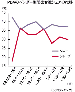 両社以外は、東芝、カシオ計算機、パームコンピューティングが続いており、10%前後のシェアで3位争いを繰り広げている。シャープも以前はこの争いの中にいたが、昨年12月9-15日の週から一気にシェアを伸ばし、ソニーの独り勝ち状態に割って入ってきた。