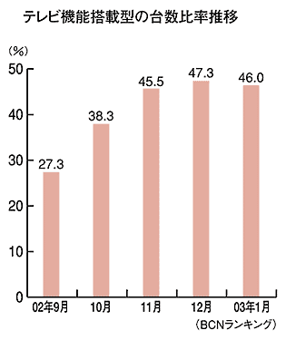 電子情報技術産業協会(JEITA)が発表した02年暦年(1-12月)における国内パソコンの出荷台数は、前年比11%減の1002万7000台と、過去最大の落ち込みとなり、初めて2年連続の前年割れを記録した。今年度(03年3月期)通期については、前年度比約6%減の1000万台強の見通し。そんな状況下、今後はオリジナルパソコンとの差別化に向け、メーカー製デスクトップにはテレビ機能を搭載する傾向が高まると見られる。
