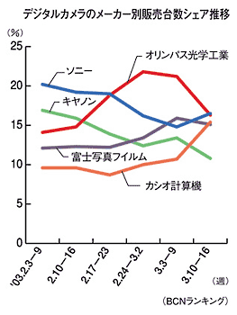 3月10-16日は、ソニーが16.5%でトップ。次いで、オリンパス光学工業が16.3%、カシオ計算機が15.4%、富士写真フイルムが15.1%、キヤノンが10.8%と続く。同週は、首位と5位のシェアの差が、わずか5.7ポイント。2月3-9日が10.6ポイントの差だっただけに、シェア争いが一層エスカレートしていることになる。最近6週間をみると、ソニーが今年2月17-23日まで首位を維持していたものの、オリンパスが2月24-3月2日に21.8%を獲得し、首位が入れ替わった。オリンパスは、3月3-9日に21.2%で首位を維持。3月10-16日には、ソニーが再び首位を奪回する格好となった。