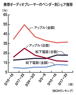 もっとも、金額ベースでみると、アップルの強さは揺るぎない。直近の週次データ(3月17-23日)で、松下電器とは24.2ポイントもの大差がある。アップルの「iPod」の価格が他社製品に比べ高めに設定されているため。この市場は、昨年8-9月にアップルがウィンドウズ版などを投入してから独占状態が続いていた。また、それ以前はアイ・オー・データ機器やクリエイティブメディアなどとともに、各社が僅差でひしめき合っていた。