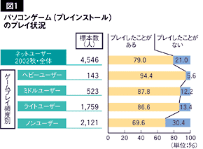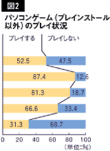 図2は、プレインストール以外のパソコンゲームの利用状況だ。プレインストールのゲームと比較すると、「プレイする」という割合はどのユーザー層でも減っている。とくに、ノンユーザーの比率は31.3%と、プレインストールされたゲームを「プレイしたことがある」と答えた人の半分以下に減少し、ライトユーザーの場合は20%減っている。これに対して、ゲームをプレイする頻度の高いユーザー層では、新たにゲームソフトを追加した割合が高い。