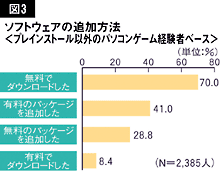 図3は、ソフトの追加方法についてだが、最も多いのが「無料でダウンロードした」という回答で、70%にのぼる。一方、有料でダウンロードしたことがある人の割合は、8.4%にとどまっている。