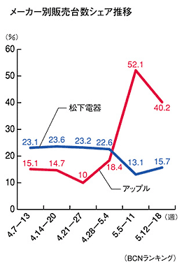 市場では、松下電器産業が3月10-16日に23.2%の販売台数シェアで首位を獲得し、これまでトップを維持し続けてきたアップルの牙城が崩れた。以来、8週連続で松下が首位を維持したが、アップルが5月9日にiPodの新モデルを発売したことで、発売週の5月5-11日に52.1%のシェアを取り首位を奪回。5月12-18日に入ってからも40.2%のシェアで首位を維持する結果となった。