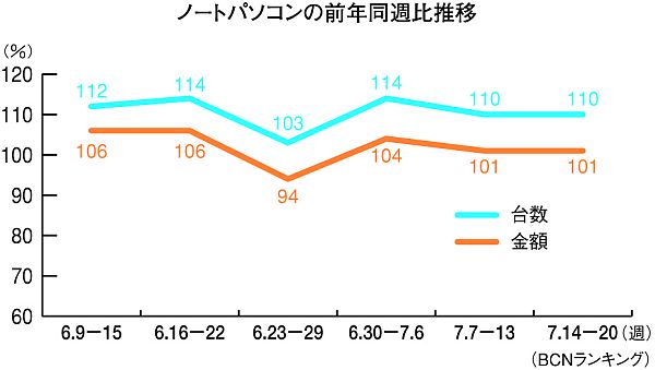 一方、デスクトップは7月第3週(7月14-20日)において、台数が前年同週の95%、金額が同92%。依然ニして厳しい状況だが、「テレビチューナー搭載機の需要が高まっていることもあり、価格が少々高くても購入する傾向にある」(ショップ関係者)と、現場には好転への気配が漂う。目新しい機能ではないものの、需要を換気する起爆剤としての要素を充分にもっているといえそうだ。