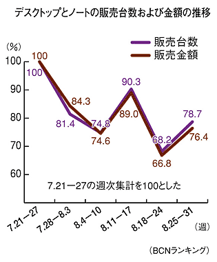 8月25-31日までのノートパソコンの週次集計によれば、東芝の台数シェアは、NECの21.4%に次ぐ20.0%で第2位。3位のソニー(15.5%)を大きく引き離す。8月上旬の東芝の台数シェアは、ソニーに次ぐ3位だった。ソニーが出荷を抑え、東芝が積極的なシェア拡大策を推進している構図がはっきりと出た。8月25日から1週間のデスクトップを見ると、NECの台数シェアが31.4%、富士通が20.4%、ソニーが18.4%と、突出した動きは見あたらない。同期間のデスクトップとノートを合わせたパソコン全体の台数シェアでは、NECが25.0%、富士通16.9%、ソニー16.6%、東芝12.6%、シャープ8.4%と続く。10月以降は、各社とも新製品を投入する見込みで、再び全体が活性化するものと見られる。