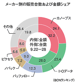 金額ベースでは、依然としてカノープスが牙城を築いている状況。競合他社と比較して低価格路線に走っていないのも特徴といえる。映像関連機器はパソコン専門店において、売れ筋製品として注目を集めている。冬商戦に向け、各メーカーのシェア争いが白熱化しそうだ。