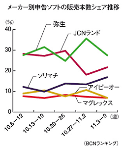 最近5週間では、販売本数で10月20-26日と10月6-12日の各週にJCNランドが一時トップに立った以外、すべて弥生が30%前後のシェアで首位を確保した。直近の11月3-9日の週では、前年同週比でJCNランドが販売本数ベースで20%減、ソリマチは45%減といずれも大幅な前年割れを起こしている。弥生は、昨年12月に発売した「やよいの青色申告」で今年7月までに1万5000件の新規顧客を獲得している。「先行した他社の製品を研究して完成度を高めた」(弥生関係者)と、後発の優位性と知名度を生かした形だ。