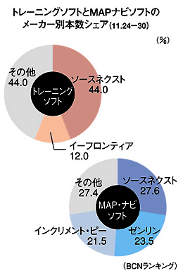 11月21日に1980円ソフト市場に参入した地図ソフト開発のインクリメント・ピーは、MAP・ナビソフト部門で、本数シェア21.5%を獲った(同)。1980円化する以前の今年8月25-31日には、同部門の本数シェアが6.2%であったことと比較すれば、大幅に躍進した。