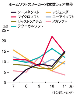 一方、2位のアジェンダも11月に、商品の買い得価格を分析できる新機能を乗せた「ミラクル家計簿2」を4000円前後の値段でリリースした。だが、同時期にソースネクストからは、同様の機能を搭載した「やりくり上手」がその半値で発売され、直近週の機種別販売シェアでトップに躍り出ている。資産管理ができる「マイクロソフト・マネー2004」やジャストシステムズのはがき作成など他機能の家計簿ソフト「ジャストホーム3」も機種別で上位を賑わすが、対象が節約志向の主婦層だけに安価ソフトが席巻しそうだ。