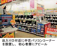 有楽町ソフマップの場合、来店者の大半は会社員で、そのうち3割は女性客だという。「女性のお客さんで比較的多いのが、パソコン初心者。そのため、ビジネスマン向けだけでなく初心者のニーズに合わせた品揃えが必要」(佐々木寛興店長)と、地域の特性に合わせた店舗作りに工夫している。ソフマップが主力としている中古パソコンに加え、デジタルカメラなど周辺機器の新品および中古品、DVDソフト、サプライ、アクセサリー品などを充実させている。最近、増えてきたのが「初心者がパソコンを購入する際、友人などから薦められて、価格の手頃な中古品を購入するケース」だという。このため、中古パソコンコーナーは一番目立つ出入り口の近くに設けている。一方、新品パソコンは、出入り口から最も離れた場所に展示している。