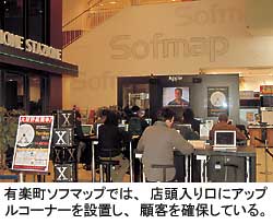 しかし、「有楽町ソフマップでは多くの女性にアップル製品を販売してきた。当店に来たことでアップルファンになった顧客も多い」と強調する。店頭の入り口には、アップルコーナーを設け、iMacなどの最新機種を体験できるスペースを確保している。そのため、「アップルユーザーからの信頼関係も築いている」と、直営店相手でも顧客数を減少させない絶対の自信をもっている。むしろ、「アップルユーザーが銀座に訪れるようになる」と、相乗効果により地域自体の集客率がアップし、有楽町地区がパソコンを購入する街としての認知度が一段と向上することを期待している。(佐相彰彦)