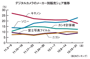 同製品の発売が功を奏し、ソニーは9週連続で首位を維持していたキヤノンの牙城を崩すことになった。キヤノンは、「イクシーデジタル」と「パワーショット」のラインアップに加え、低価格の一眼レフデジカメ「イオス・キス・デジタル」を追加したことで需要を増やし、トップシェアを堅持していた。デジカメ市場は、12月第3週が台数ベースで前年同週比87%増、金額ベースで同76%増と依然として好調で、ショップにとってプラス成長を続ける売れ筋機器の1つだ。デジカメは薄型テレビやDVDレコーダーと同様、デジタル機器の「新3種の神器」といわれているだけに、需要が一段と増える可能性が高い。