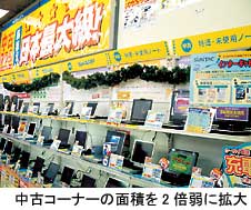 総売り場面積は約1072平方メートルと、ビックカメラ大宮西口そごう店(売り場面積6600平方メートル)に比べると小規模な店舗だ。しかし、「得意分野の商材を拡販する」(上村信一店長)と、競合店に引けをとらない体制を整えた。中古コーナーは、パソコンやデジタルカメラ、プリンタなどに加え、DVDレコーダーも扱うようになった。中古コーナー面積はリニューアル前の2倍弱となる約100平方メートルに拡大。これまで店の奥に設置していた中古コーナーを出入り口付近に移動させた。「ユーザーは中古と新品を吟味して購入する。まずは中古をみてもらい、良い商品がなければ新品を購入するように薦める」ためだ。