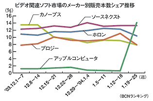 また、iPhotoで時系列で自動的に写真を管理し、レートを付けられる「スマートアルバム機能」を搭載。画像管理や検索を容易にしたほか、ネットワーク共有機能「ランデブー」に対応し、家庭内ネットワーク上のコンピュータ間で写真の共有が可能となった。iDVDにより画像や映像、楽曲などを活用してオリジナルDVDを作成できることも特徴となる。ビデオ関連ソフト市場は、ショップで売れ筋の商材の1つだ。1月19-25日の週次データでも、本数ベースで前年同週比67%増、金額で同30%増となっている。メーカーにとっても、成長市場だけに拡販に注力したい分野。1%前後しかなかったアップルが上位メーカーを追い抜き首位を獲得したことで、シェア争いにも拍車がかかりそうだ。