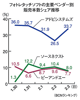 「ペイントグラフィック」は、販売後5日間で平均10%前後のベンダー別販売本数シェアを獲得。フォトレタッチソフトで先行するピーアンドエーとほぼ互角の戦いだ。フォトレタッチソフトの巨人で同期間の平均販売本数シェア約30%を獲るアドビシステムズにはまだ及ばないものの、激しい2位争奪戦はすでに始まっている。