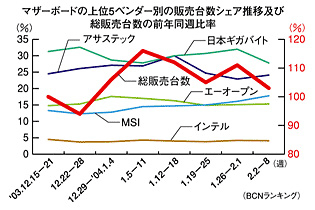 昨年11月末からは、3.6ギガに対応したMSIの「865G Neo2-PLS」が上位を脅かす位置につけ、同製品の効果で、今年1月19-25日の週からエーオープンを抜きベンダー別販売台数シェアが約18%で3位に上がった。2月2-8日の最新週では、上位10機種がすべて対応版で全販売台数の約3割を占めている。ベンダー別では、日本ギガバイトがトップで、アサステックが続く。ただ、アサステックは、ペンティアム4のハイエンドユーザー向けに販売している高額の対応版「P4P800デラックス」が牽引し、総販売金額で日本ギガバイトを抜いてトップに立った。