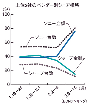 シャープ製品の中で現在最も製品別シェアの高いモデルが発売された時(2003年5月)の週次データをみても、シャープのベンダーシェアが約10ポイント高まった程度であったことと比較して、「PEG-TH55」の好調さがうかがえる。シャープの売れ筋モデルは、ソニー製品に比べ1-2万円高価格であるため、金額ベースでは僅差の争いを続けていたが、金額でも約60ポイントの差をつけられ、大きく水をあけられた。