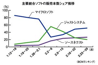 だが、翌週の2月9-15日の集計では、販売本数ベースでジャストシステムが42.2%とシェアを落とし、マイクロソフトは33.6%へと持ち直した。一太郎ユーザーの初期購入が一巡し、再び元のシェア構造に戻り始めたためだ。その後も、ジャストシステムのシェアは縮小し、2月23-29日の集計では本数ベースで20.2%となった。これに対し、マイクロソフトは51.5%と回復傾向にある。