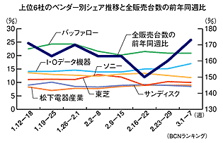 多くのメーカーが記録媒体に採用している「SDカード」陣営は、松下電器産業のSDマルチカメラ「Dスナップ」やデジカメなどのヒットで、3月1-7日の週で東芝と松下電器の2社の合計販売台数が前年同週比約3倍に伸びた。「メモリースティック」陣営は、ソニー1社がデジカメと携帯電話の販売で奮闘し、同陣営のシェアを支えている。メモリカード市場でベンダー別シェア1位のバッファローと2位のアイ・オー・データ機器は、持ち運び用ストレージ製品のUSB対応フラッシュメモリが好調。バッファローの「クリップドライブ」シリーズはここ数週間、機種別でトップ5位内に3製品が入っている。アイ・オー・データ機器の「イージーディスク・メイト」も128メガ版が10位につけるなど上位を賑わす。