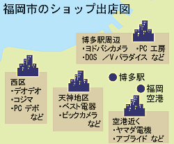 福岡県福岡市は、JR博多駅前を中心として半径10キロメートル圏内に多くのパソコン専門店や家電量販店が店舗を構える。