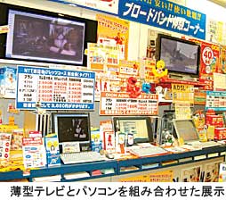 佐々木副店長は、「映像とコンピュータは融合の方向にある」とみており、「これまでは各コーナーで専門的な従業員を配置していたが、AV(音響・映像)機器コーナーとパソコンコーナーに関しては、両コーナーを担当する」ことに取り組む。まずはパソコンおよび関連機器フロアで、パソコンとテレビを組み合わせた展示を開始した。ブロードバンド体験コーナーでは、パソコンと薄型テレビを接続。「ADSLでストリーミング映像を鮮明に流せる点をアピール。さらにその映像を大画面テレビでも視聴できることを提案している」