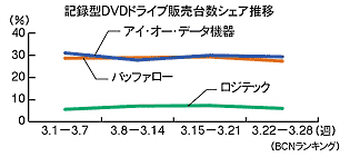 バッファローも同等機能の製品を次々と投入し、アイ・オー・データ機器を猛追する。3月8-14日の週次集計では、バッファローの販売台数シェアが29.1%を記録し、アイ・オー・データ機器の28.0%を追い抜いた。業界関係者は「記録型DVDドライブの機能強化と価格下落は激しく、わずかな違いがシェアを大きく左右する」と、両社の厳しい戦いを指摘する。業界関係者は、「今後1年間は、テレビキャプチャーとの連動や地上デジタル番組の記録など、付加価値に焦点を当てた競争になる」とみている。