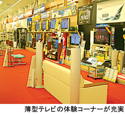 AV(音響・映像)機器売り場では、薄型テレビとDVDレコーダーを体験できるようにソファーを用意。ユーザーがゆっくりとDVDなどを視聴できるようにした。パソコンコーナーでは、本体とインクジェットプリンタなど関連機器をパソコンデスクの上に並べ、インテリアを提案。春商戦本番の3月末までは、入学や進学を切り口としてパソコンやプリンタのセット販売で割り引くといったキャンペーンも実施した。ほかにも、家電機器で電器シェーバーやフェイシャル商品の体験コーナーを設置した。渡辺孝浩店長は、「単に展示するだけでなく、部屋で使うシーンをユーザーにイメージしてもらうことが購入に結びつく。しかも、薄型テレビやパソコンなどメインの商品だけでなく、ソファーや机などの販売にもつながっている」と、家電製品以外の販売にもつながったと笑う。