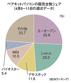 ベアキットパソコンとは未完成のパソコンのことで、ユーザーがパーツを別途購入し組み立てる必要がある。PCケース、マザーボード、電源がセットになっているモデルが多く、ハードディスクやドライブなどは自分の好みに合わせて購入し、完成させる。BCNランキングの週次データ(4月5-11日)では、前年同週に比べ台数で146%増、金額で119%増を記録。メーカー系パソコン全体が台数で14%減、金額で16%減と不調なのに対し、大幅に伸びている。東京・秋葉原のカクタソフマップによると、「パワーユーザーが中心だった数年前に比べ、最近では初心者がパソコンに詳しい人を伴って来店し、購入する姿が目立つ」という。初心者にも需要の裾野が広がっていることが、好調の要因と言えそうだ。