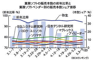 業務ソフトで販売本数を伸ばしているのは、低価格で初心者向けの会計ソフトを出す企業だ。「プロフェッショナル版は当分出さない」と、初心者向けに特化するBSLシステム研究所は、3月中は苦戦したが、安定的にシェア2位をキープ。経済紙の広告で機能のシンプルさをアピールし続けたアイピーオーも「爆笑!経理」が伸び、5月3-9日の週でミロク・ユニソフトを抜きシェア6位に踊り出た。業界トップの弥生は、4月19-25日の週で販売本数が前年同期比12%減となるなど前年割れが続く。だが、「当初から改正消費税の需要はまだ先と読んでいた」と、今後の需要期に新たな戦略を打つ予定だ。「改正消費税でも需要が伸びなかった」と見るには早計かもしれない。