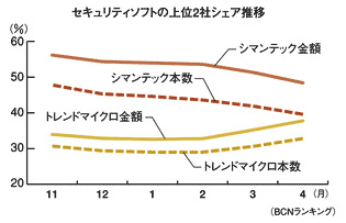 これに対し、シマンテックは「ノートン・インターネットセキュリティ2004」にセキュリティ対策の解説本と、パソコン上で使うIDやパスワードを一括管理できるソフトの体験版を同梱した特別モデルを用意。30万本限定で6月4日から販売開始し、突き放しにかかる。今年前半戦のトップシェアはどちらが獲るのか──。シェアが拮抗してきたなかでのキャンペーン合戦だけに、成り行き次第では順位が逆転する可能性もある。2強の争いがますます熾烈になってきた。