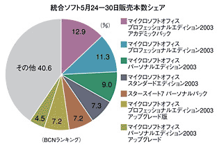 ソースネクストの販売本数の約半分を占める「スタースイート7パーソナルパック」は、5月月間シェアで8.6%と、マイクロソフトの「オフィスパーソナルエディション2003」の7.9%を上回るシェアとなり、「売り場に定着した商材」(販売店)になった。