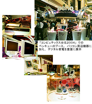 今月1-5日までベンキューの地元である台湾・台北市で開かれた「コンピュテックス台北2004」では、約3000の出展ブースのなかでもトップクラスの展示面積で、デジタル家電メーカーをアピール。小さなブースが所狭しと並ぶ展示が特徴のコンピュテックス会場の中で、圧倒的な存在感を示した。