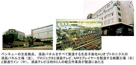 生産拠点は台湾のほかメキシコなど4か国に工場を保有。プロジェクタや液晶テレビの製造を行う台北市内の桃園工場では、液晶テレビを1週間で450-550台製造する。約50人が流れ作業でそれぞれの持ち場を担当。色バランスの確認など、15種類以上のテストを実施し梱包まで行う。液晶プロジェクタでは、清潔さが求められることから、クリーンルームを5つ設置し、5種類のテストを徹底し厳しい品質管理を行う。工場内では、ベンキューブランド製品だけでなく、他社のロゴの入った製品が普通にラインを流れる。OEMビジネスの実績を垣間見ることができた。