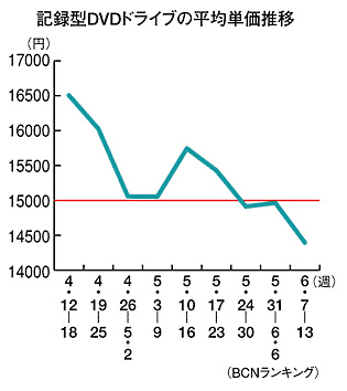 メーカー別のシェアを見ると、アイ・オー・データ機器が台数ベースで33.1%、金額ベースで34.3%(6月7-13日の週次データ)でトップ。2位にはバッファローが台数、金額ともに19.3%、3位にはLG電子ジャパンが台数17.4%、金額13.0%となっており、アイ・オー・データ機器が水をあけている。記録型DVDドライブを標準搭載するパソコンの増加に加え、DVDおよびハイブリッドレコーダーの台頭が記録型DVDドライブ市場を縮小させている感は否めない。だが、低価格化で新たな顧客層を囲い込む可能性もあり得る。「置いておけば売れる」時期を過ぎたいま、販売店各社の拡販施策で明暗が分かれる商材になってきた。